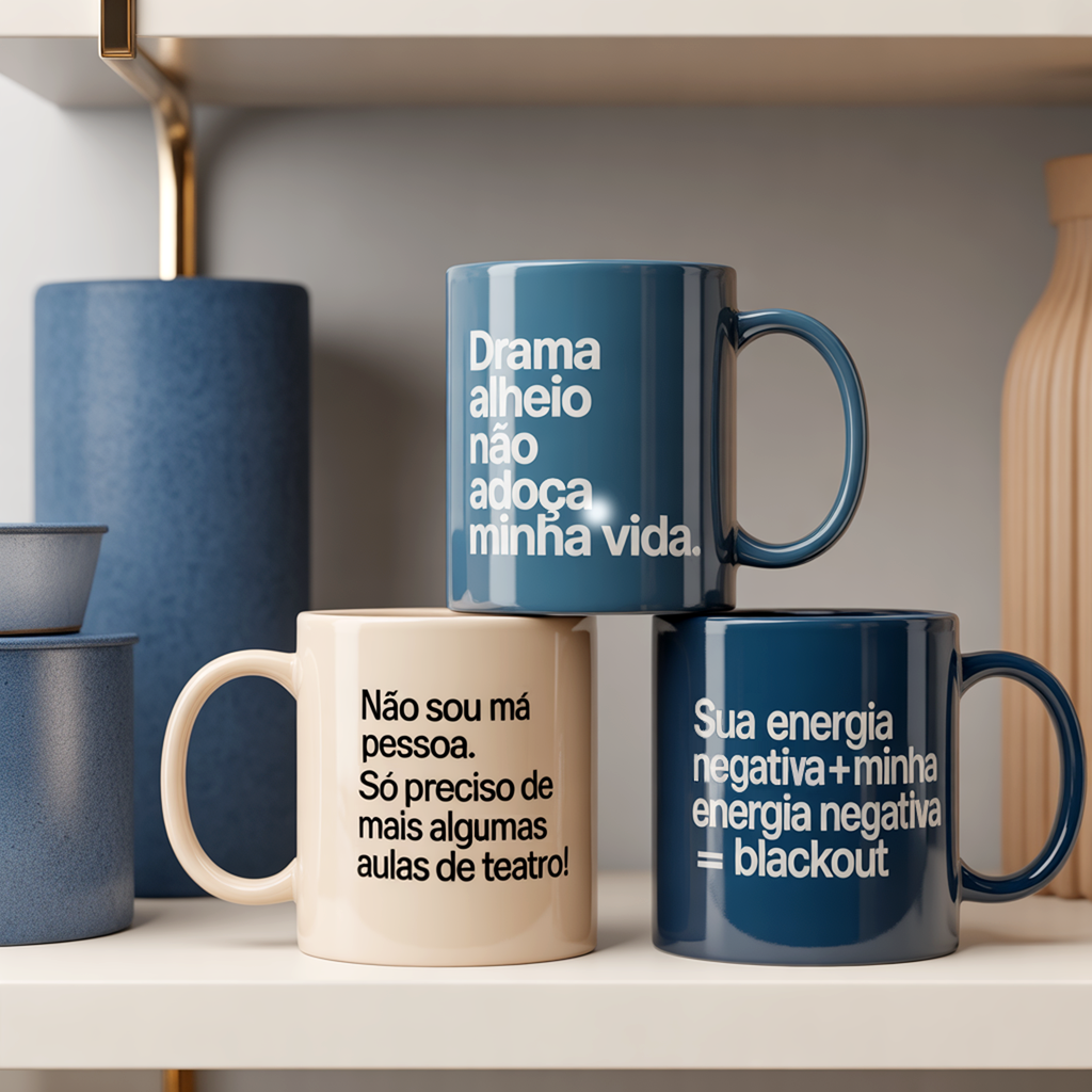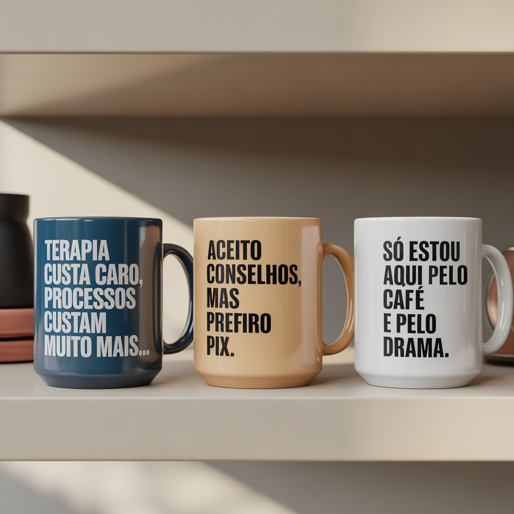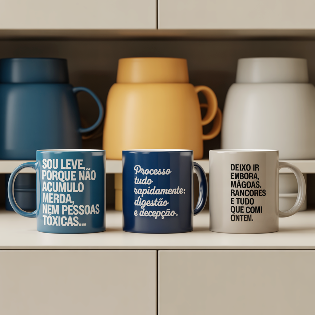 Quando canecas viram pedradas… cada frase é um soco de realidade! São provocações, reflexões ácidas, humor negro e aquela sinceridade desconfortável servida em dose dupla. A gente precisa de munição para enfrentar o dia — e se essa munição vier estampada numa caneca que aquece as mãos enquanto queima verdades na garganta? Perfeito. Não é só café. É combustível, é resistência, é arte que bate de volta.