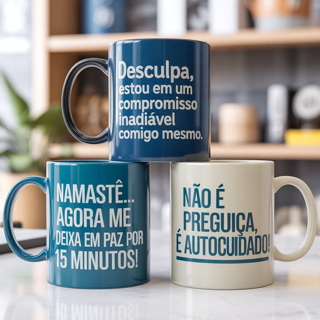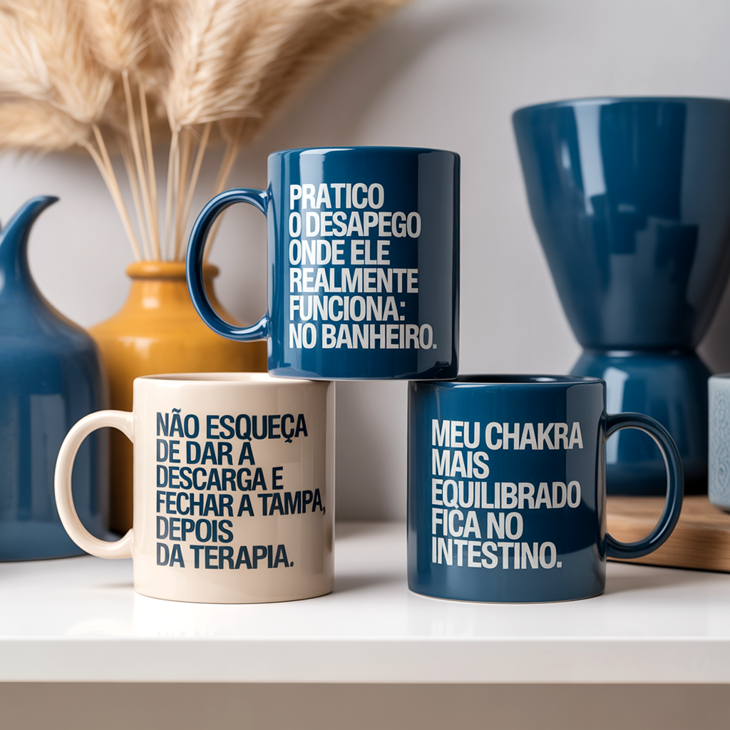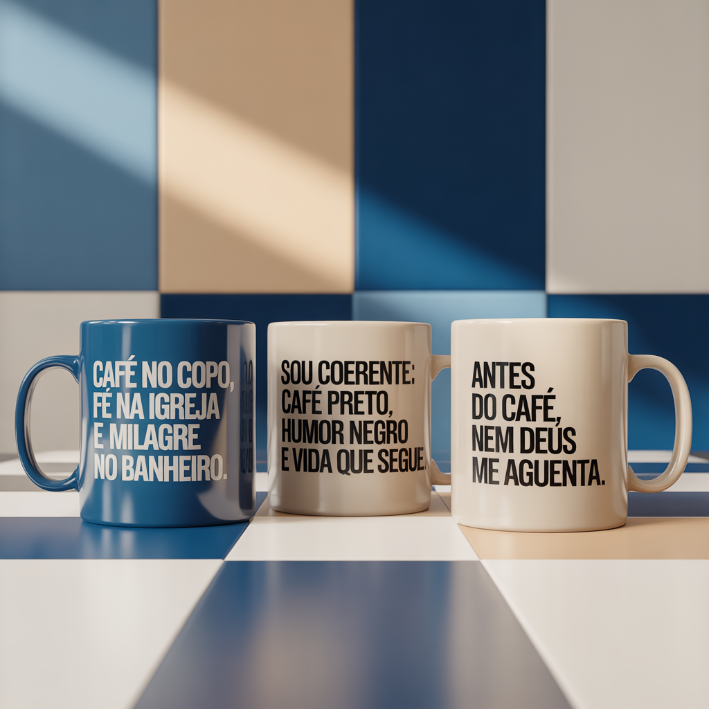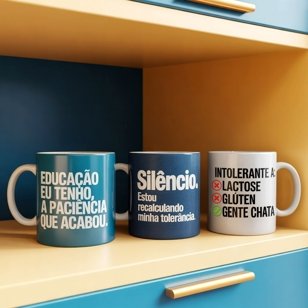 Quando canecas viram pedradas… cada frase é um soco de realidade! São provocações, reflexões ácidas, humor negro e aquela sinceridade desconfortável servida em dose dupla. A gente precisa de munição para enfrentar o dia — e se essa munição vier estampada numa caneca que aquece as mãos enquanto queima verdades na garganta? Perfeito. Não é só café. É combustível, é resistência, é arte que bate de volta.